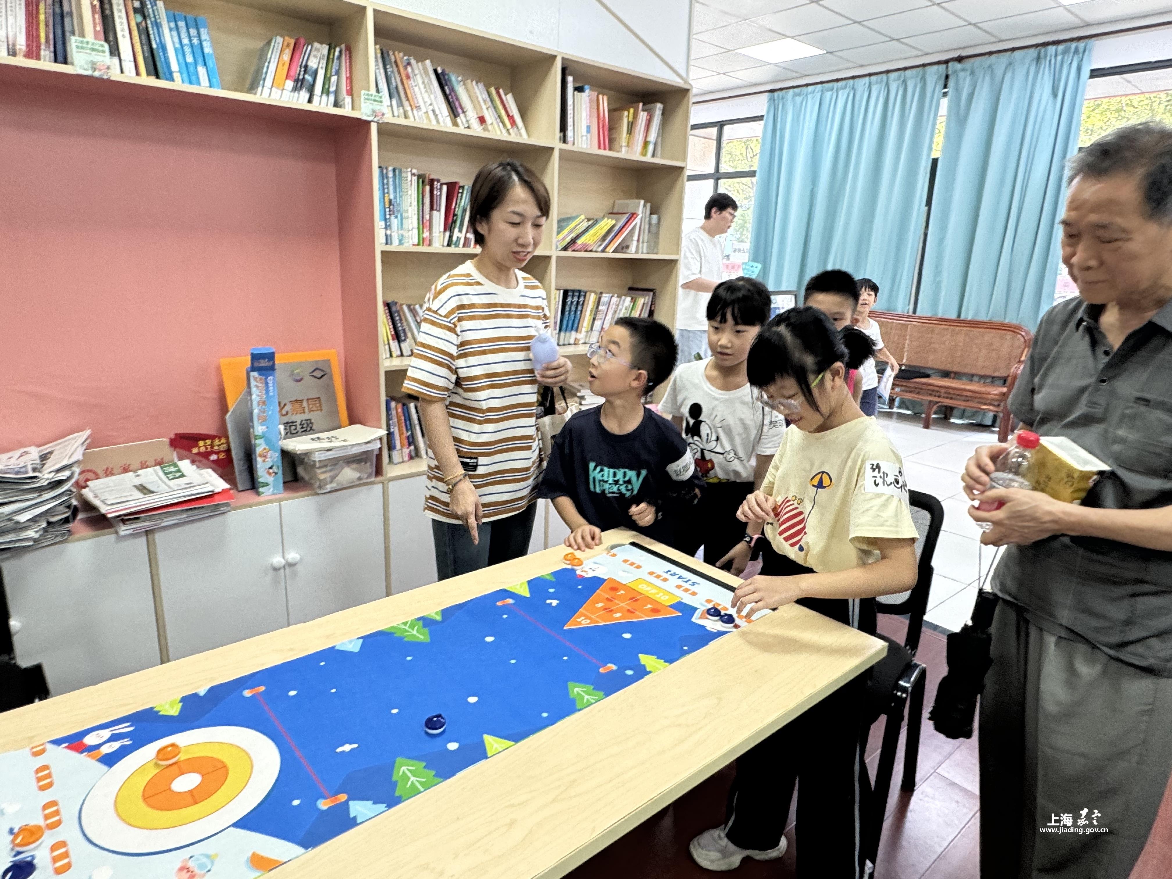 传统棋类运动常因“静坐久坐”被贴上“单调”的标签,而儿童暑期沉迷电子产品的问题也日益凸显。嘉悠社区居委会敏锐捕捉到这一痛点,以“智体融合”为理念,将棋类策略思维与体能挑战结合,设计出五大创意项目:桌面冰壶、飞行棋体能挑战、投壶、迷你台球与弹力抛接球。